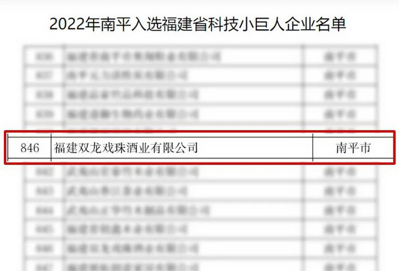 近日,福建省科學(xué)技術(shù)廳公布了2022年“福建省科技小巨人企業(yè)”名單,福建雙龍戲珠酒業(yè)有限公司憑借雄厚的技術(shù)實(shí)力和卓越的產(chǎn)品品質(zhì),從眾多企業(yè)中脫穎而出,獲評(píng)“福建省科技小巨人企業(yè)”。