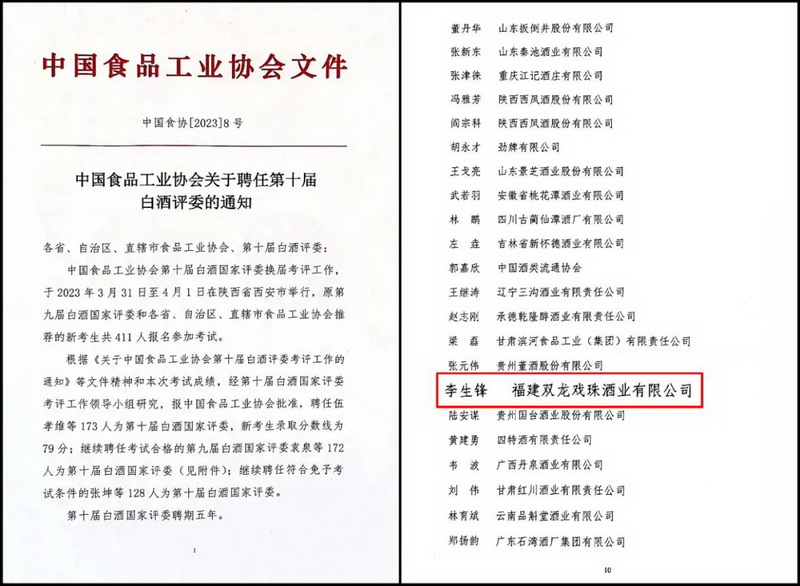 近日,中國食品工業(yè)協(xié)會發(fā)布了《關(guān)于聘任第十屆白酒評委的通知》,雙龍戲珠酒業(yè)技術(shù)總工程師李生鋒通過層層推薦、選拔、考試,被聘為第十屆國家級白酒評委。