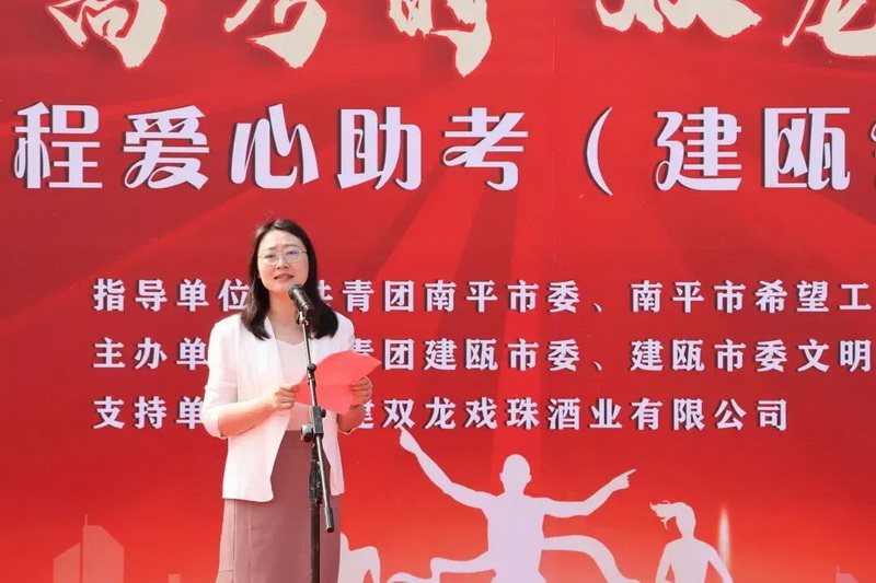 為給考生提供及時、周到的服務(wù),讓考生安心赴考,6月5日,由南平團市委指導(dǎo),建甌團市委、建甌市委文明辦、建甌市教育局聯(lián)合福建雙龍戲珠酒業(yè)有限公司舉辦“圓夢高考時 雙龍助騰飛”南平市希望工程愛心助考(建甌會場)集中宣傳活動在建甌市博物館新館前廣場順利舉行。南平團市委副書記王婷,建甌市委常委、組織部部長胡宗捷,建甌市委文明辦主任虞樂雄,建甌市教育局黨組書記、局長何華生,共青團建甌市委書記祝菁等單位主要領(lǐng)導(dǎo),福建雙龍戲珠酒業(yè)有限公司副總經(jīng)理吳小如出席活動,建甌市青年志愿者和愛心司機代表約60余人參加本次活動。