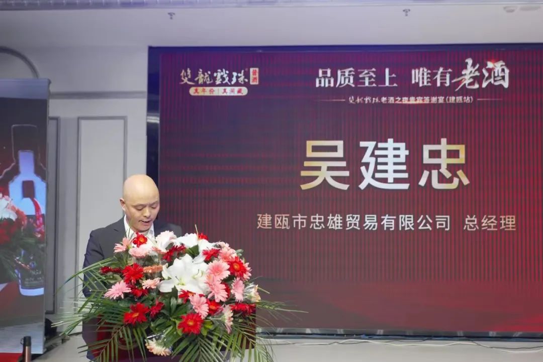 品味醬香,共筑盛宴!11月26日,以“品質(zhì)至上 唯有老酒”為主題的雙龍戲珠老酒之夜貴賓答謝宴(建甌站)在建甌市富貴武夷大酒店隆重舉行。福建雙龍戲珠酒業(yè)有限公司董事長黃德鋒、建甌市忠雄貿(mào)易有限公司總經(jīng)理吳建忠出席活動并致辭。