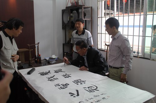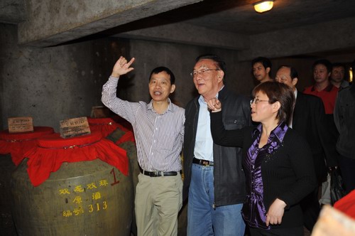 2011年5月25日,沈老在參加完“雙龍戲珠酒專家鑒評會”后,在總經(jīng)理馮敏的陪同下參觀雙龍戲珠酒業(yè),從釀造車間、研發(fā)中心、罐裝車間、雙龍洞每到一處沈老都饒有興趣停下來仔細(xì)觀察和總經(jīng)理一起探討釀造工藝,對我公司獨(dú)創(chuàng)的“六糧釀造及洞藏”給予了很高的評價,沈老說在福建能釀出多糧濃香型白酒實屬不易呀,勉勵我們要堅持原漿釀造,為福建的白酒事業(yè)做出貢獻(xiàn),參觀后沈老還和眾專家一起為雙龍戲珠酒題詞“雙龍戲珠、閩酒之冠”。