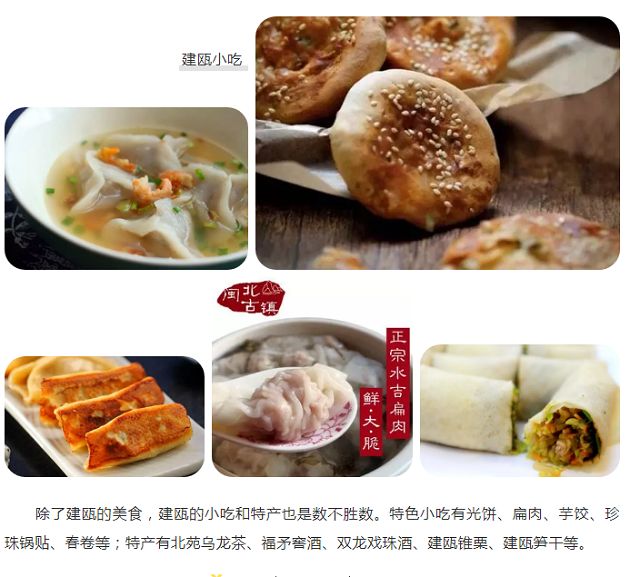 除了建甌的美食,建甌的小吃和特產(chǎn)也是數(shù)不勝數(shù)。特色小吃有光餅、扁肉、芋餃、珍珠鍋貼、春卷等;特產(chǎn)有北苑烏龍茶、雙龍戲珠酒、建甌錐栗、建甌筍干等。