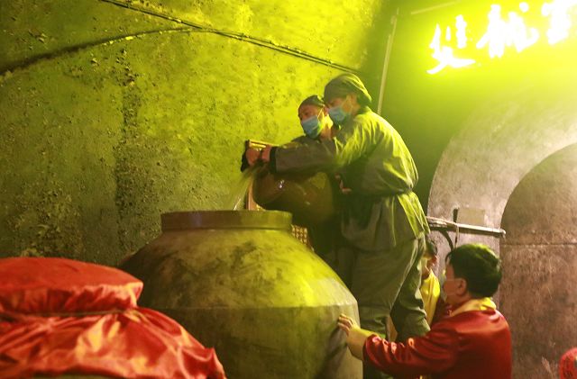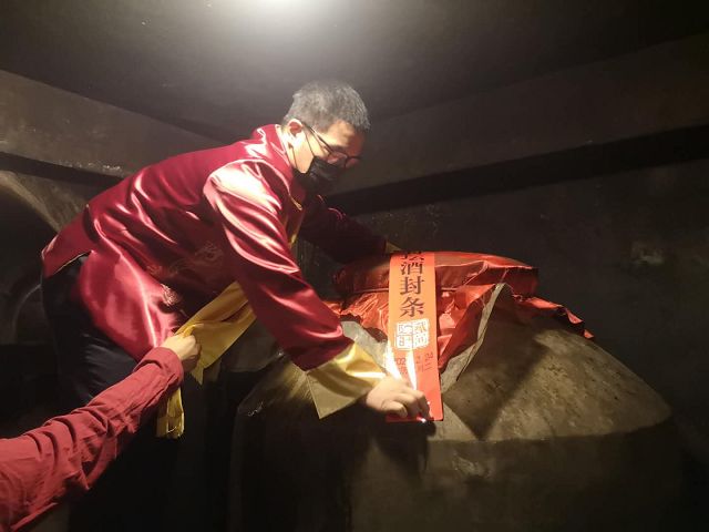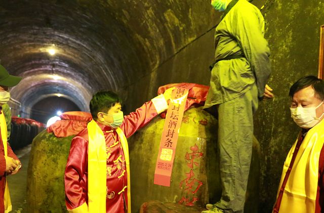 封壇儀式上,董事長(zhǎng)黃德鋒,總經(jīng)理黃盛堯帶領(lǐng)雙龍戲珠釀酒人護(hù)送今年的第一鍋春釀酒緩緩步入雙龍洞,分別將兩壇50斤的春釀酒倒入東南第一大壇——濃香母壇和醬香母壇。母壇總?cè)萘?000斤,每年二月二加入50斤第一鍋春釀酒,母壇加滿需要60年,今年已經(jīng)是第十九年了,加滿后每年二月二打出50斤給來(lái)賓品嘗,再加入50斤進(jìn)去,以此循環(huán),讓這兩壇酒將來(lái)成為雙龍戲珠打造百年酒企的實(shí)物見證!