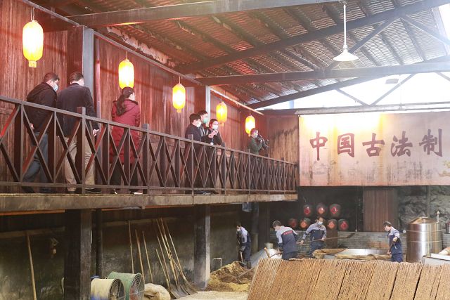 在雙龍戲珠酒業(yè)有限公司董事長黃德鋒的陪同下,陳建新一行依次參觀走訪了雙龍戲珠酒廠品牌展示大廳、釀造車間以及貯酒山洞雙龍洞。