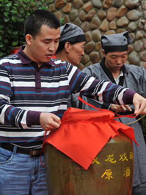 “雙龍戲珠”四個字,是由著名國學大師、紅學家、書畫家、金石家、中醫(yī)學家文懷沙先生題寫的。文懷沙先生是一位108歲的老壽星,文懷沙先生十分好酒,也因酒與雙龍戲珠結(jié)緣。